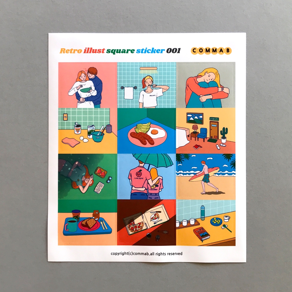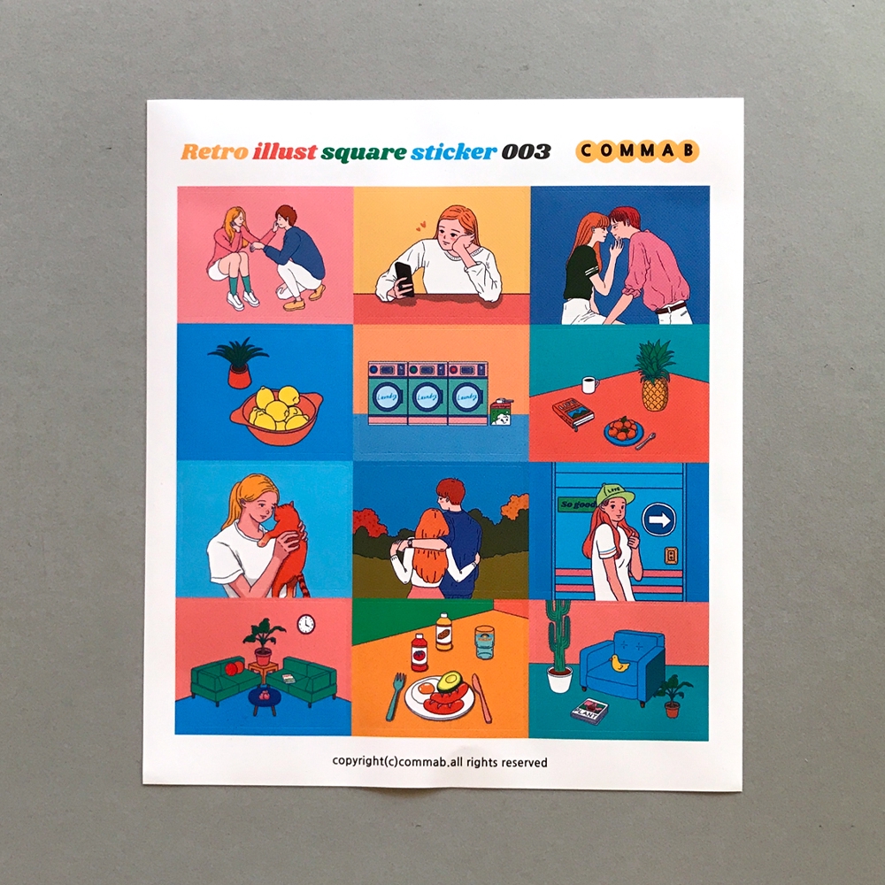 สติกเกอร์สี่เหลี่ยมสีสันสดใสสะดุดตา สไตล์เรโทรจาก commaB มีรูปวาดแนว Lifestyles ที่หลากหลาย ไม่ซ้ำกันให้เลือกใช้ตกแต่งได้ตามใจชอบ ทั้งไดอารี่เล่มโปรด ของใช้รอบตัว หรือกล่องของขวัญตามโอกาสพิเศษๆ ช่วยเพิ่ม gimmick ให้ของนั้นๆ ดูมี story ที่ไม่ธรรมดาขึ้นมาได้เลยล่ะค่ะ! แถมมีการเคลือบด้าน ทำให้ผิวหน้ามีความลื่นและทนต่อการเปรอะเปื้อน ถือเป็นหนึ่งในไอเทมกุ๊กกิ๊กที่น่าสนใจสุดๆ